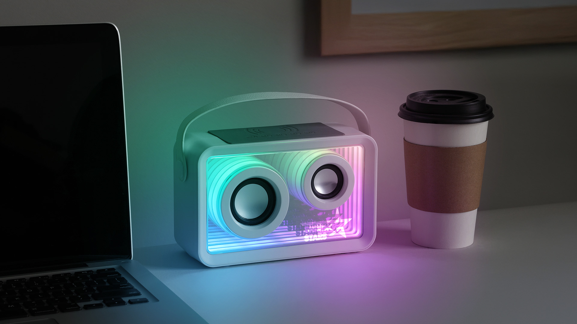 Elevate your audio experience with the Infinitunes Wireless Speaker. This striking 10-watt speaker features a captivating mirrored infinity effect that creates an endless tunnel of light, transforming any space into a visual spectacle. Dynamic RGB lighting adds immersive style to every beat, while the built-in wireless charging pad on top lets you power compatible devices as you listen. Infinitunes delivers powerful sound in a design that’s impossible to ignore.