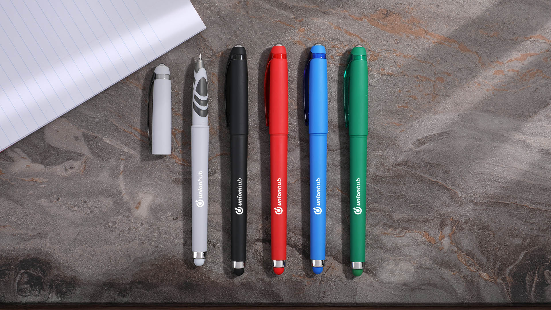 Experience comfort, style, and versatility with the Rocklin Velvet-Touch VC Stylus Gel Pen. Designed with a convenient cap-off style and built-in stylus, it seamlessly transitions from paper to touchscreen. The cap features a sleek steel ball top that is perfect for subtle fidgeting during long meetings or brainstorming sessions. Its smooth, velvet-touch finish feels great in hand, while the black medium-point tip and high-quality gel ink deliver consistently smooth, precise writing.