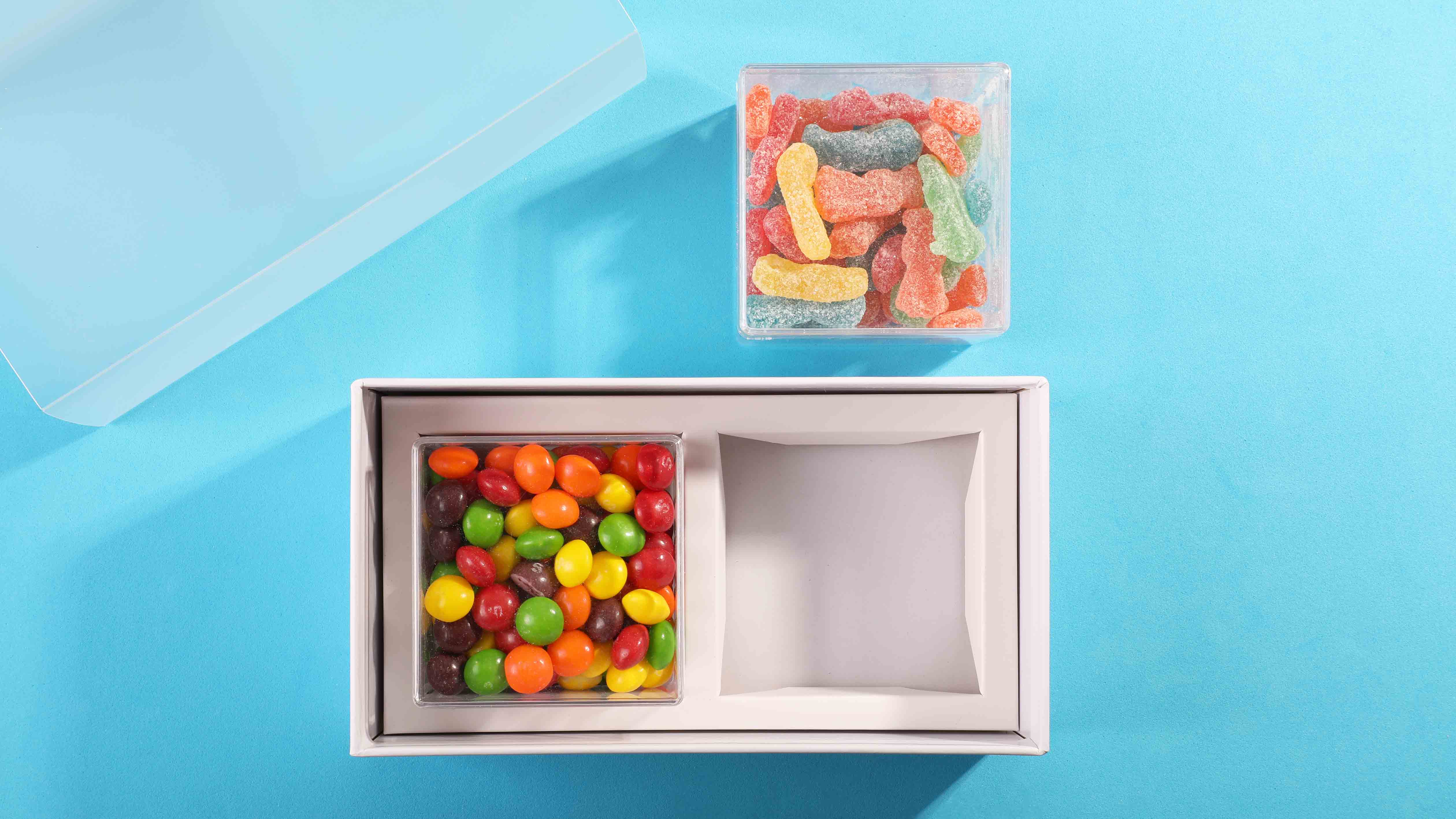 A gift that puts your brand front and center! The Sweet Duo Set: Deluxe includes two clear candy-filled cubes in a modern retail-style box with a clear sleeve for maximum impact. Choose from our curated collection of deluxe candy options.