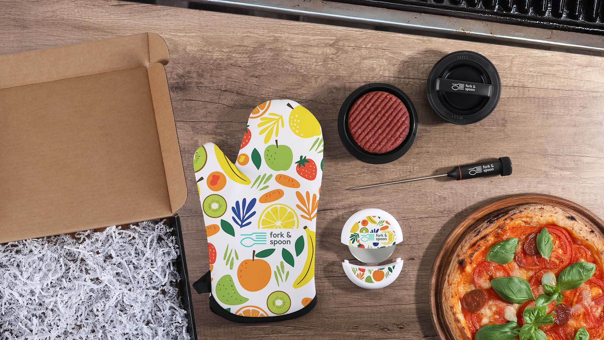 Fire up the grill! You're all set for a night of grilling with our BBQ kit. The included oven mitt has a heat resistant back that withstands temperatures up to 500° F and hosts a large imprint area for a stunning full color branding impression. The burger press guarantees uniform stuffed or large burgers every time. We’ve also included a digital kitchen thermometer and pizza cutter providing your recipient with accessories for a successful night of grilling. Each kit comes with a generic note card that can be personalize with your own messaging.