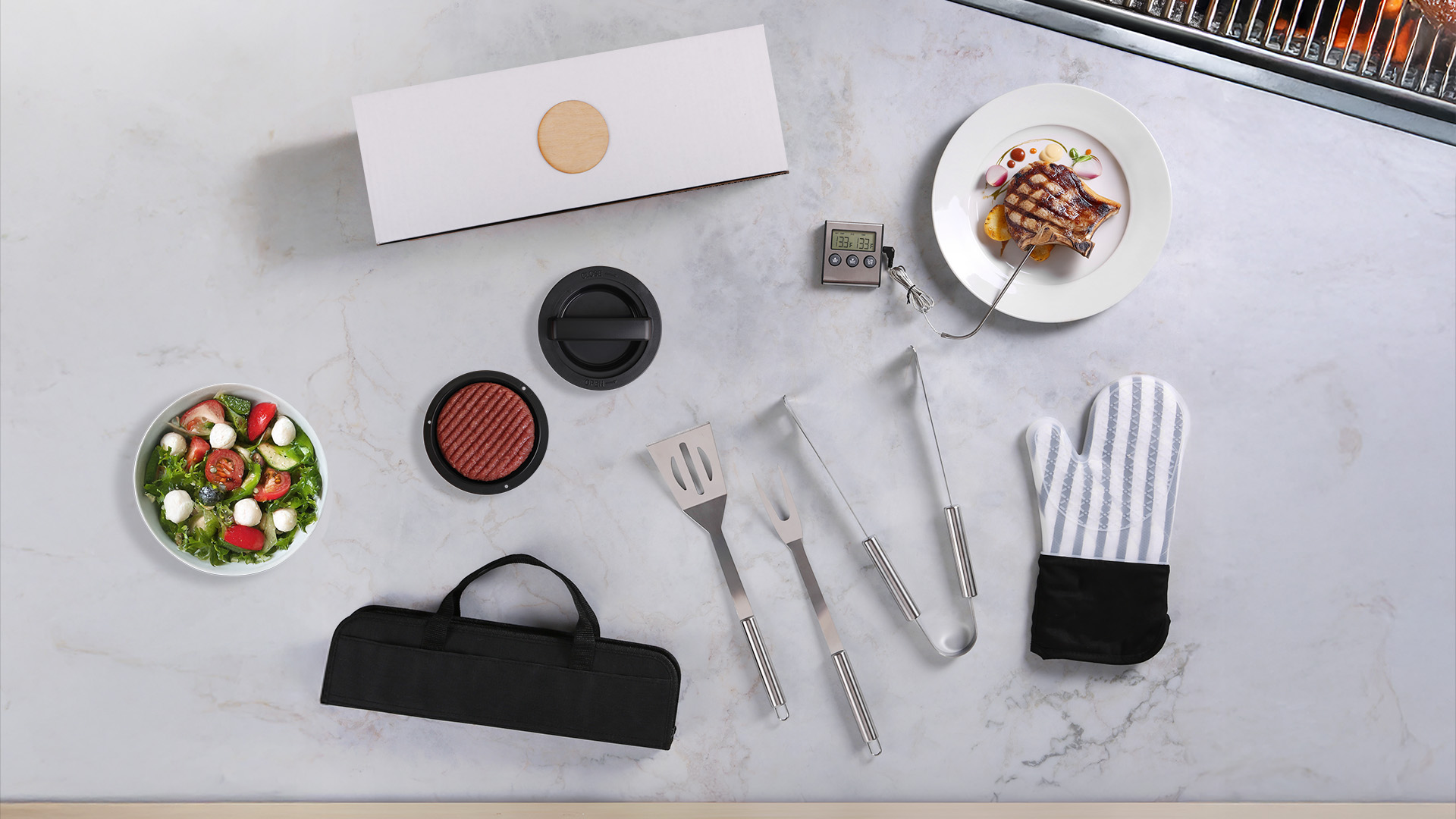 Grill to thrill with the Blazinâ BBQ Kit Deluxe! This kit has all the essential gadgets for a great BBQ, including a Frosted Silicone Oven Mitt, Grill Easy 3 Pc. Stainless BBQ Utensil Set with RPET Case, Grill Easy Cooking Thermometer and Timer and Perfect Patty Burger Press, create uniform stuffed or large burgers every time. It completes your grilling experience, enhancing the quality and convenience of every cookout, impressing guests, and creating unforgettable moments of joy and togetherness.