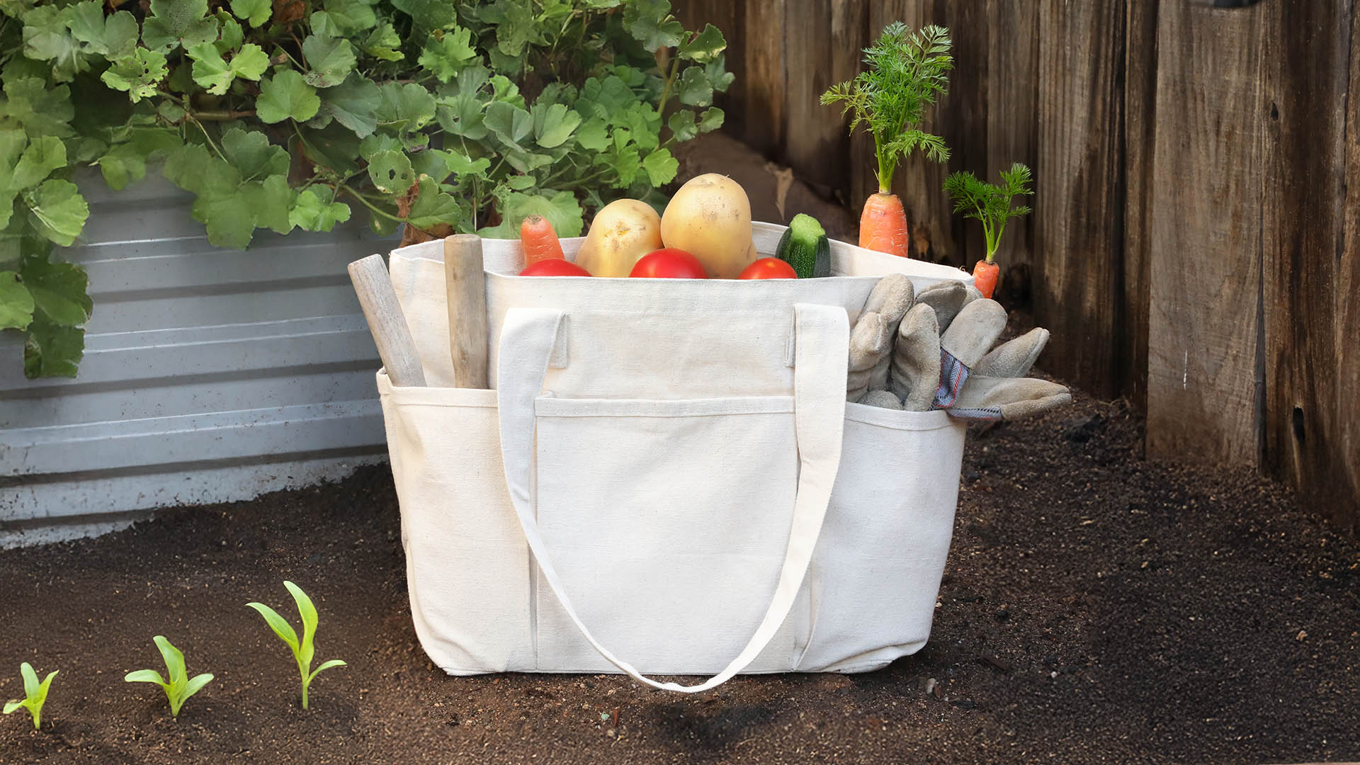 Stay organized while you garden with this durable and eco-friendly bag. Made from 10 oz. recycled cotton, it features six gusseted exterior pockets to hold all your essential tools, spray bottles, sunscreen, and more. The large open main compartment provides ample space for freshly-picked produce straight from the soil. Sturdy 25" handles with reinforced cross stitching make carrying heavy loads easy. Perfect for gardeners who need a reliable, all-in-one tote. Meets FDA requirements.