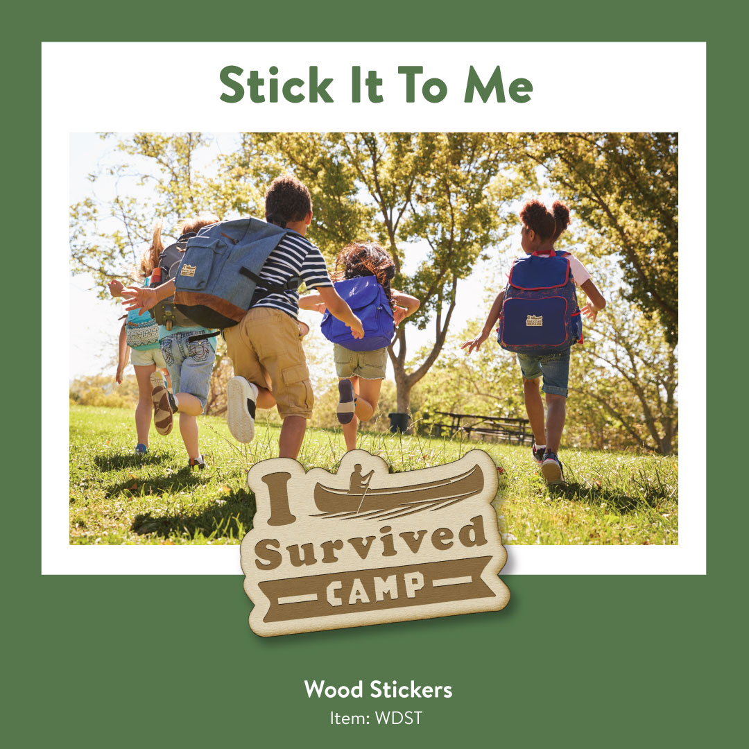 Add your brand to their fashion statements and turn everything into branded camp merchandise with a wood sticker. Campers & staff members be able to add your brand to a variety of their daily accessories with these simple yet timeless earth-friendly stickers. They'll carry your brand on the city transit system with a wood sticker on their back pack, or bring your brand into their classrooms with a camp sticker on their notebook. Your brand will gain thousands of impressions througout the lifetime of their camp wood sticker.